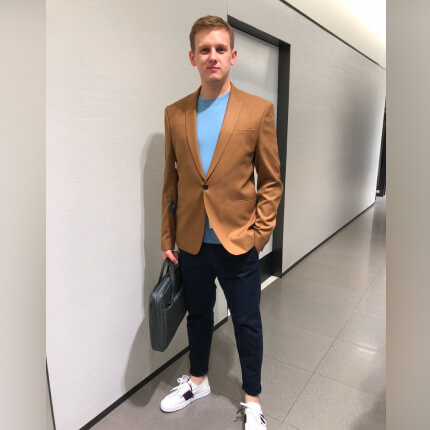 Павел - это молодой и амбициозный IT специалист, который приехал покорять Москву. У Павла встречи с клиентами проходят в ТЦ. Его образ должен был быть презентабельным и в то же время спортивным для быстрого передвижения на метро.